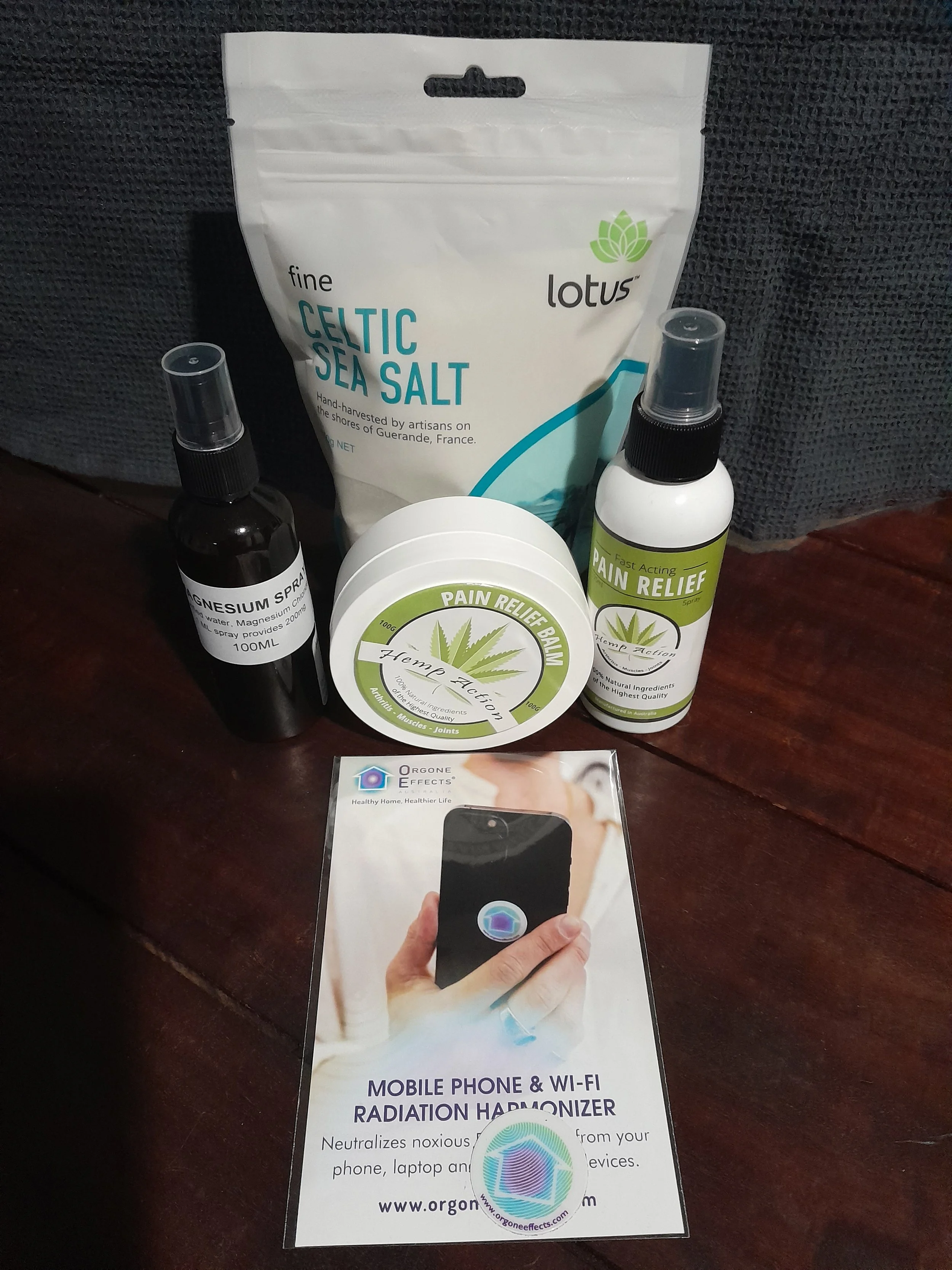 We have a range of products available to assist your wellbeing including Hemp Action Pain Relief Balm and Spray (Australian Made ); Magnesium oil/spray; Epsom salts; Celtic sea salt and a small range of Orgone EMF solutions